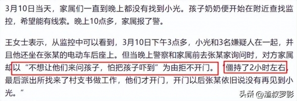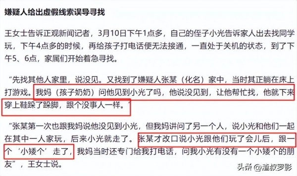 后来张某眼看瞒不住了,于是就说自己当时确实将小光叫了出来,并且还和小光一起玩了,但是玩了一会,就有一个"小矮个"把小光叫走了。