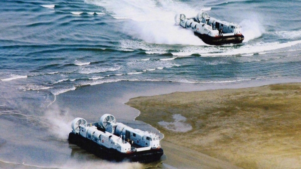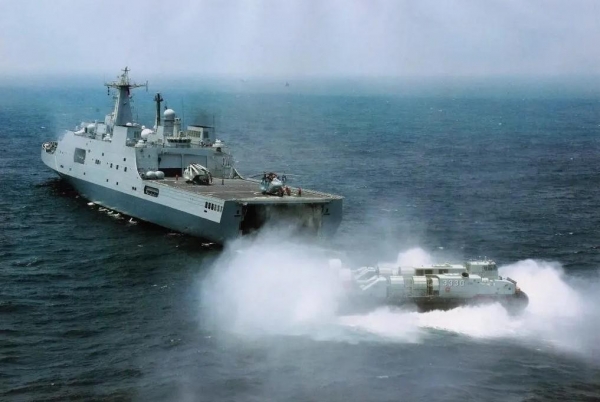 071登陆舰排水量2.5万吨。可容纳4艘726型"野马"气垫登陆艇,运载近50辆各类装甲作战车辆,携带4架直-8直升机,运送一个标准的800人陆战营。它具备垂直立体登陆作战能力。一架直-8直升机可搭载约27名登舰战斗人员垂直登岛;一艘726可载1辆ZTD-05两栖突击车和2辆ZBD-05两栖步兵战车和陆战队员80人超平面登陆。
