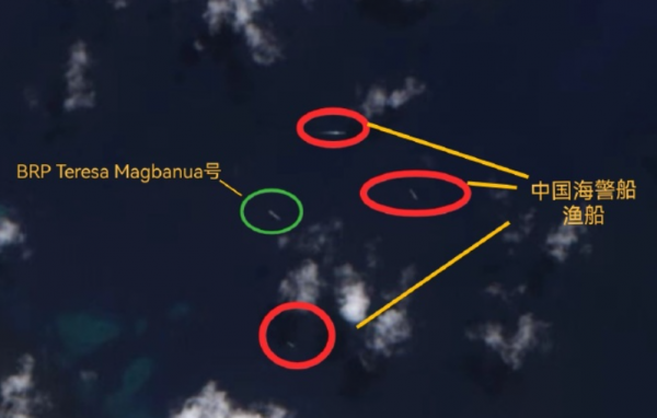有西方商用卫星公司近日发布了仙宾礁海域中菲双方船只的位置情况。目前仙宾礁潟湖内共有中方6艘渔船和2艘海警船。其中1艘距离菲律宾在仙宾礁潟湖内锚泊的"马格巴努亚"号巡逻舰只有3.8公里处,中国海军的071型登陆舰距离菲方船只也只有几公里的地方。