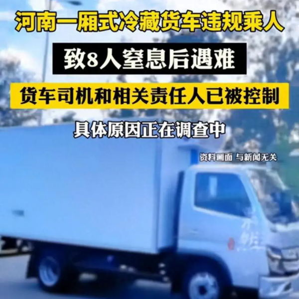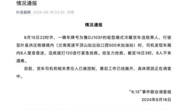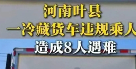 2024年6月15日,河南省平顶山市一辆轻型厢式冷藏货车违规乘人,行驶至叶县洪庄杨镇境内时,司机发现车厢内8人窒息昏迷,遂拨打120进行紧急抢救。经全力抢救,截至16日3时,8人均遇难,8名遇难者皆为女性。