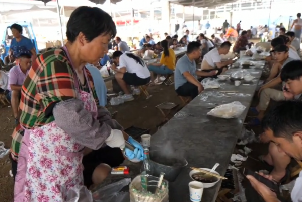 老板娘很手脚麻利,不停地给客人盛着汤,仍然不赶趟,队伍排出去十几米远,棚子底下的座位全部坐满了,上百人同时喝羊肉汤的场面真得很壮观。