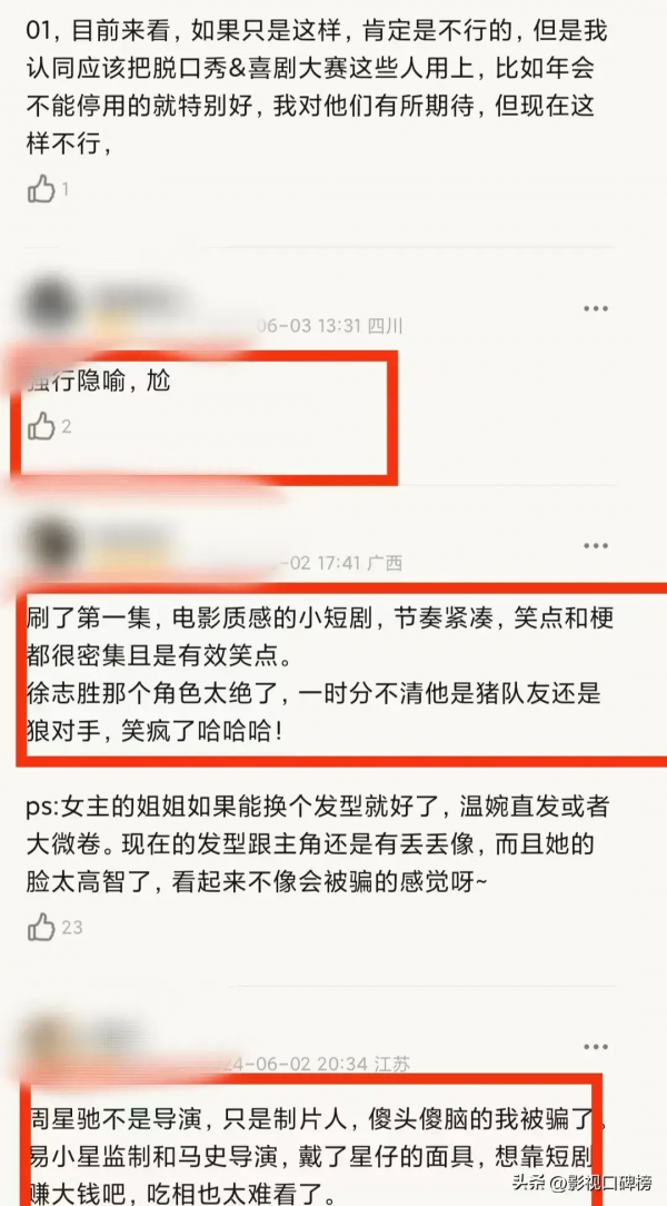 网友更是对他投资制片这部短剧感受到不解和疑惑,有的人认为这是在自降身份准备资本下场割短剧韭菜,对它一开始就抱有怀疑否定的态度;有的人则是就冲着"含星量"去的,主打一个情怀和买账;有的观众追剧后给出的审判态度反响觉得它是短剧中的佳肴,短剧的时长有着电影的质感,认为星爷功力不减,此番输出纯纯降维打击为整顿市场而来。
