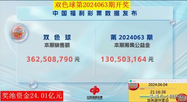 双色球24063期的开奖详情。本期总销量约为3.62亿元,相比上期约减少了2776万余元。因为最近开出大奖的数量比较少,当前的奖池资金达到了24.01亿元。
