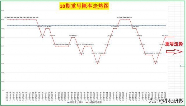 其实,本期持续开出重号的情况并不意外。因为当前的重号概率仅为60%,比理论重号概率还要低13%。这也意味着重号持续回补的可能性是非常大的。另外还需要说明的是,每期开出的重号数量并不会影响到重号概率的计算。