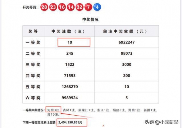 本期开奖总共中出10注一等奖,单注奖金约为692万。一等奖分别出自河北、吉林、黑龙江、浙江、福建、湖北和新疆,其中河北独揽3注一等奖,位列第一名。此外,本期还中出了245注二等奖,单注奖金仅为9万余元。