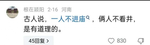 还有一名网友这样回应:在历史上流传着这样一句话,"一个人不进庙,两个人不看井",