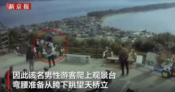 2月15日发生的这一情景真的令人心生恐惧。他的身体突然向前倾斜,一阵尖叫声中,他失去平衡摔倒在悬崖边缘。天桥立被列为日本的三大名胜之一,其壮观的自然风光吸引了大量的观光客。这名不幸的观光客越过了观景平台,低下头准备从胯部俯瞰天桥,但在那一瞬间,他失去了稳固的足后跟。