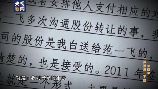 一个典型例子,就是范一飞帮助一个叫刘琦的商人,承接了一个手机银行相关项目,与此同步,范一飞弟弟的公司就和刘琦的公司签订"协议",名义上是收购刘琦公司部分股权,实际上范侃一分钱都没出,就是白收刘琦给的干股。
