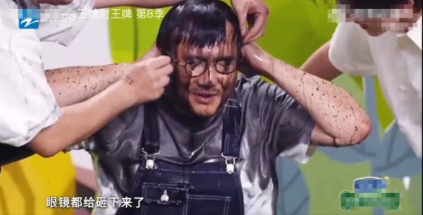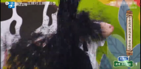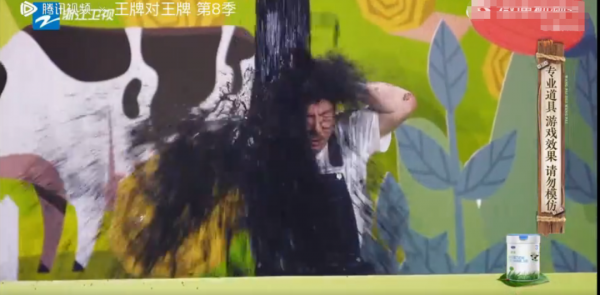 在游戏环节中,乌黑的墨水倾盆而下,大量粗壮的水柱直接砸在沈腾的脑袋和脖子上。