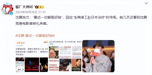 沈腾最近一直在为《飞驰人生2》跑宣传,希望他能照顾好自己身体,劳逸结合,保重好身体,今后为大家带来更多优秀作品!