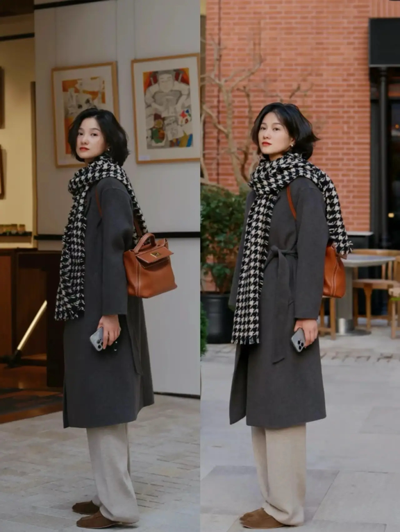 深灰色的大衣穿上身显得低调又简单,如果你在穿大衣的时候想要凸显出时尚感,那么你可以像这些气质女人一样系上围巾,戴上格纹的围巾,丰富了造型的层次感,显得很有氛围感,真的很优雅。