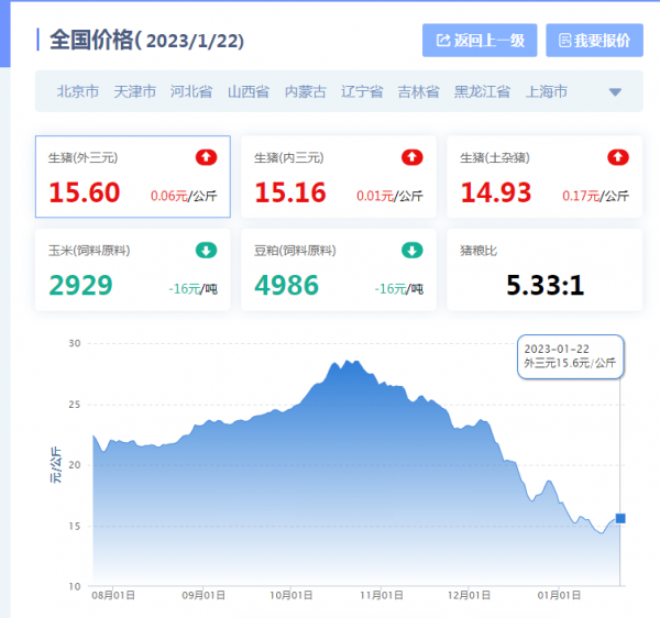 据国内某猪价系统了解,1月22日,全国外三元生猪均价上涨0.06元,报价15.6元/公斤,内三元生猪报价上涨0.01元,均价15.16元/公斤,而土杂猪报价上涨0.17元,均价14.93元/公斤!
