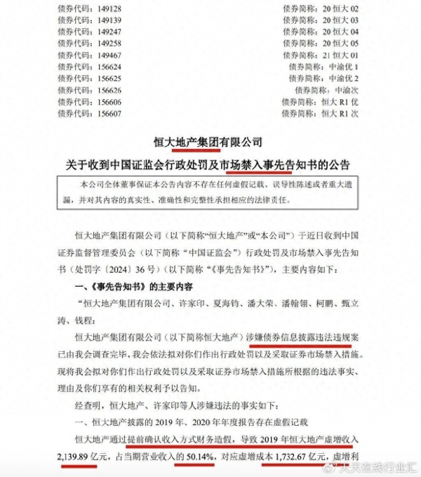 公告披露,《事先告知书》中,中国证监会表示,经查明,恒大地产集团有限公司、许家印、夏海钧、潘大荣、潘翰翎、柯鹏、甄立涛、钱程涉嫌违法。