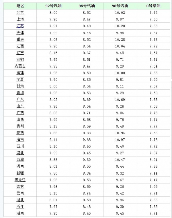 从市场反馈来看,5月22日,各省市加油站92号汽油价格执行年内第10次调价的水平,各省市加油站92号汽油价格普遍在8元/升左右,山东报价在7.96元/升,北京报价在8元/升左右,具体参考下图!