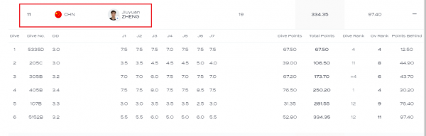 到了决赛,郑九源依然状态低迷,第一跳他中规中矩拿到67.50分排名第四,第二跳205C郑九源出现严重失误,炸鱼式入水,只拿到了39.00分,排名下滑到第八。郑九源第三跳67.20分,第四跳拿到76.50分,这是他本场比赛唯一发挥出高水准的一跳。但是第五跳,郑九源又出现重大失误,只拿到31.35分,排名掉到第九,已经无望拿到奖牌了。