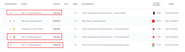 19岁的郑九源并非菜鸟选手了,这是他第三次征战世锦赛。2022年布达佩斯世锦赛,郑九源获得男子1米板第八名。2023年福冈世锦赛,郑九源获得男子1米板第三名。郑九源还在福冈世锦赛参加了混合团体比赛,和队友合作夺得了冠军,从而有了世界冠军头衔。