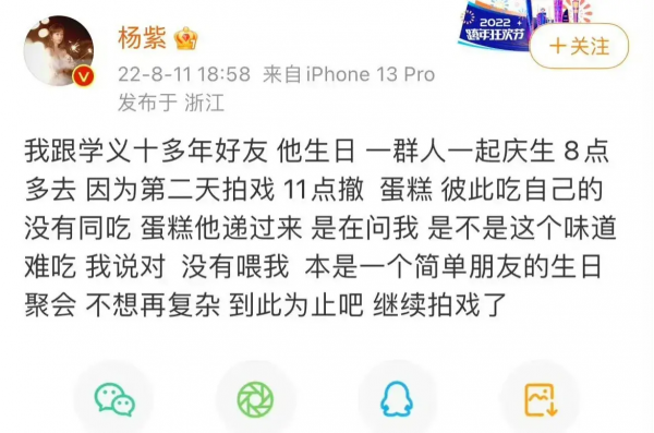 对此,杨紫方当天就进行了辟谣,表示自己和刘学义是多年好友,且当时的情景并不是大家所看到的那样,当时大家一起聚会,刘学义将蛋糕递给她,只是询问她对该蛋糕口味的意见,她闻了一下表示是不好吃,并未吃到嘴中。
