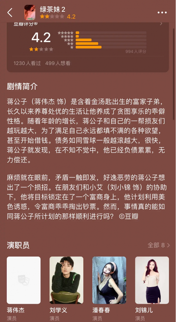刘学义不知道多少年前出演的一部电影也被人扒出来了,这部电影名字叫《绿茶妹》,这名字给人的感觉就是,这部电影本身没什么营养。