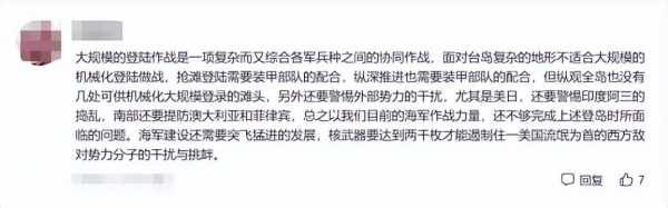 另外还要警惕外部势力的干扰,尤其是美日,还要警惕印度趁着台海冲突的时候,在中印边境捣乱,南海方向,我们还要提防澳大利亚和菲律宾。总之以我们目前的海军作战力量,还不够完成上述登岛时所要面临的问题。海军建设还有很多不足之处,还需要进一步强大提升实力,才可以在战时低于美西方敌对势力的干扰与挑衅。"