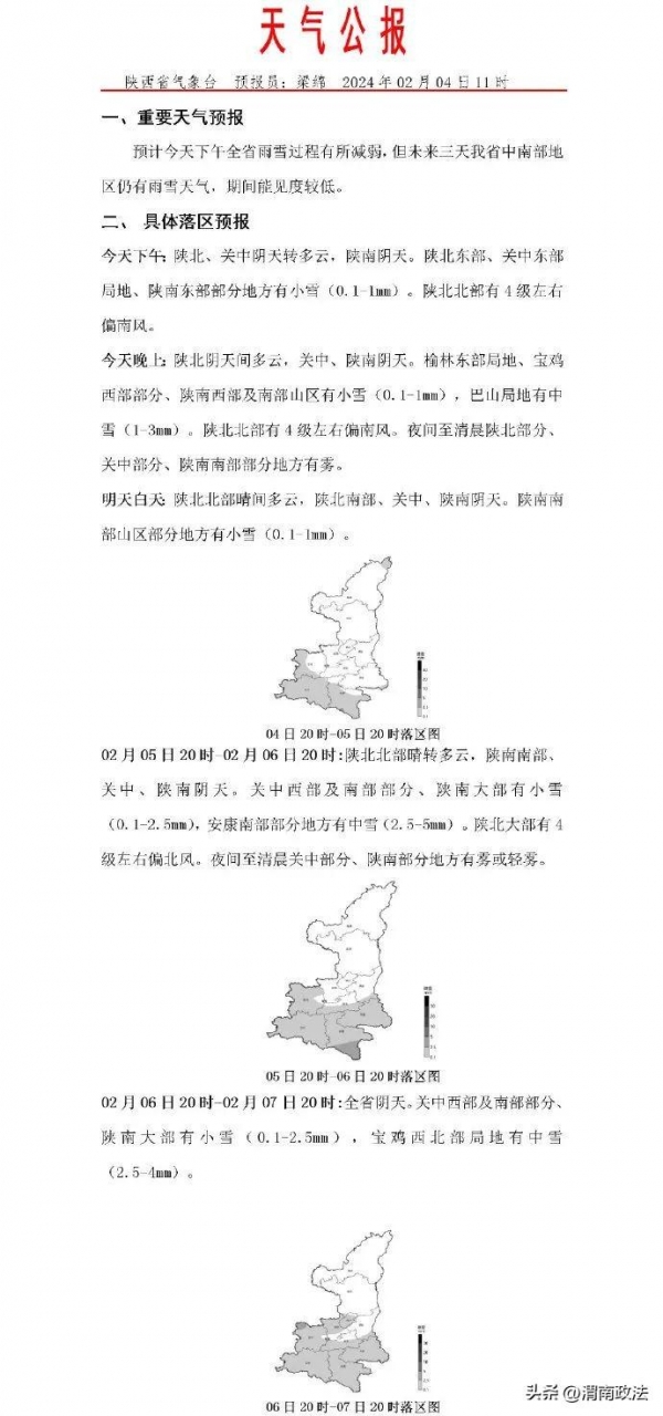 陕西省气象台2024年2月4日11时30分解除暴雪蓝色预警:由于我省大部地区雨雪减弱,故解除暴雪蓝色预警。但下午到傍晚陕北东部、关中东部、陕南东部部分地方仍有小雪,请注意防范。