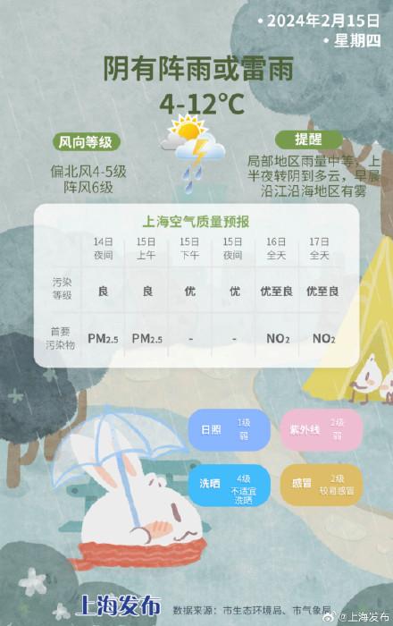 春节假期进入倒计时,外出的小伙伴们准备返程了吗?明天白天上海阴有阵雨或雷雨,局部地区雨量中等,夜里转阴到多云。白天风力也比较大,偏北风4-5级阵风6级,沿江沿海地区6级阵风7-8级。明天气温还将会出现倒置,最高气温出现在早晨,预计在12℃左右,之后气温一路走低,最低气温在夜间,市区仅有4℃上下。目前寒潮蓝色预警依然高挂,16日(初七)最低气温市区2℃左右,郊区在-2℃到-1℃,有薄冰。17-21日,新一波寒潮将自西向东、自北向南影响我国大部地区,受此影响,上海下周阴雨天气增多,20日起气温全面回落至11℃以内,阴冷体感将再度上线。