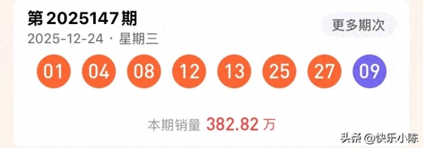 2025年12月24日21:15,中国福利彩票七乐彩第25147期开奖在公证人员全程监督下顺利完成,当期开奖号码正式揭晓:基本号码01、04、08、12、13、25、27,特别号码09。全国范围内仅诞生1注一等奖,单注奖金1687712元,幸运儿最终花落江苏苏州,成为平安夜最令人羡慕的"福气赢家"。随着本期开奖落幕,七乐彩奖池稳步累积,为后续开奖持续蓄力。