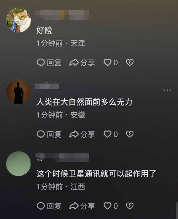 安徽网友感叹:人类在大自然面前多么无力。反映了对人类在自然灾害面前的脆弱和无助的深刻认识。江西网友建议:这个时候卫星通讯就可以起作用了。