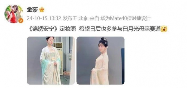 10月15日,金莎晒出两个定妆照回应:"《锦绣安宁》定妆照,希望日后也多参与白月光母亲赛道。"