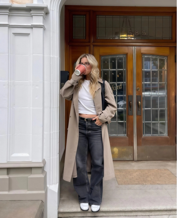 早春气温忽高忽低,大衣的厚度和挺括感能帮你挡住早晚的寒意,而牛仔裤那股硬朗又随性的丹宁材质,正好能中和掉大衣容易产生的严肃感和沉闷气,这种材质上的软硬碰撞,才是让搭配看起来高级的核心逻辑。