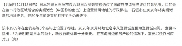 据共同社报道,日前石垣市议会以压倒性优势通过投票,同意向政府申请登陆许可,在中国钓鱼岛上设置地标物,理由是50多前的"标注"太过陈旧,需要进行更换,以此表明是所谓"日本领土"。