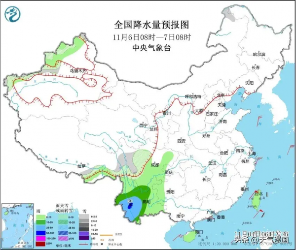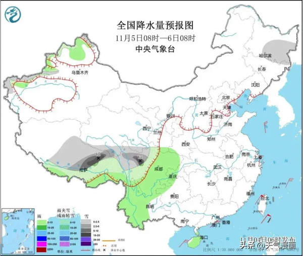 西藏北部、西南部和中东部,川西高原、四川盆地、云南西北部,还有吉林东南部、内蒙古东北部、黑龙江中部,这些地方的朋友可得注意了,部分地区已经飘起了小到中雪,甚至雨夹雪。