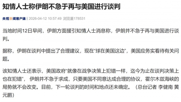 当地时间12日早间,伊朗方面援引知情人士消息称,伊朗并不急于再与美国进行谈判。