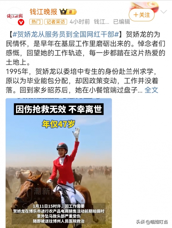 据新闻报道,贺娇龙于1月11日,在博乐市进行农产品电商销售活动前期拍摄时,因坠马,导致头部严重受伤。