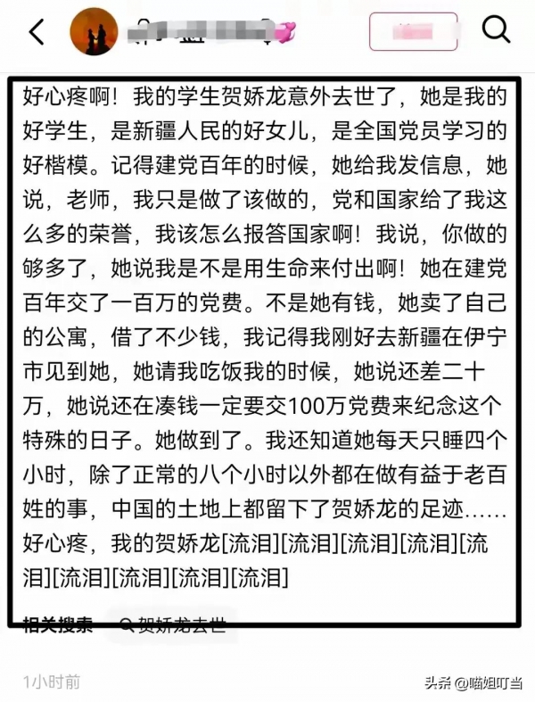 从贺娇龙坠马受伤,到被宣告去世,狠狠的揪着亿万人民的心,网友纷纷表示痛心不已。因为贺娇龙拍摄视频,并不是为了自己做网红,而是为了带动家乡的发展。