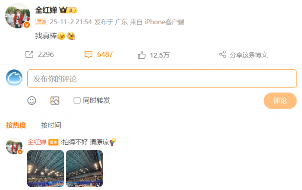 赛后,全红婵在社媒上发文:我真棒。在评论区,她还晒出现场图,表示:"拍得不好,请原谅。"
