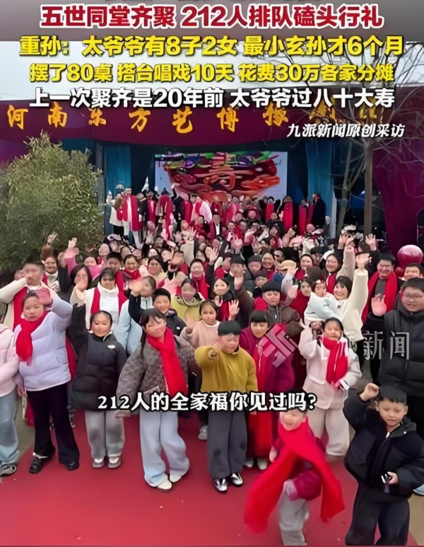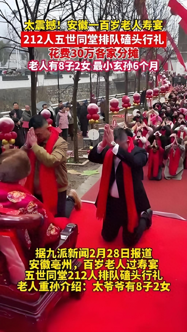 2026年正月初十,安徽亳州的一个农家大院,直接被热闹裹成了红气球。百岁袁老爷子的寿宴,把散在天南海北的子孙全薅回了家。212个人,从百岁寿星到6个月大的玄孙,按辈分排成长龙,挨个给老人磕头。这画面刷爆全网,有人喊暖心,有人喷封建,吵成了两锅沸腾的粥。