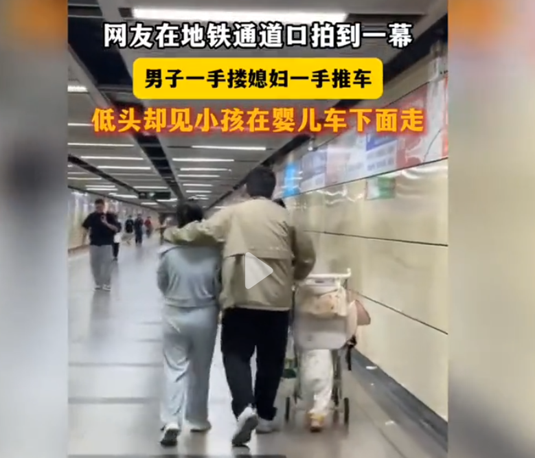地铁通道里,一对夫妻的背影看起来格外温馨:男子一手搂着妻子,一手推着婴儿车,步伐轻快,满是岁月静好的模样。可当镜头往下移,网友们却笑出了声 -- 婴儿车下,一个小小的身影正跟着脚步亦步亦趋,原来孩子根本没在车里,正贴着地面 "自力更生" 地走路。