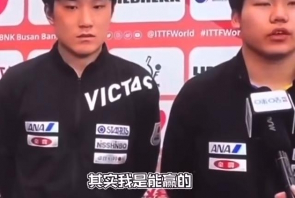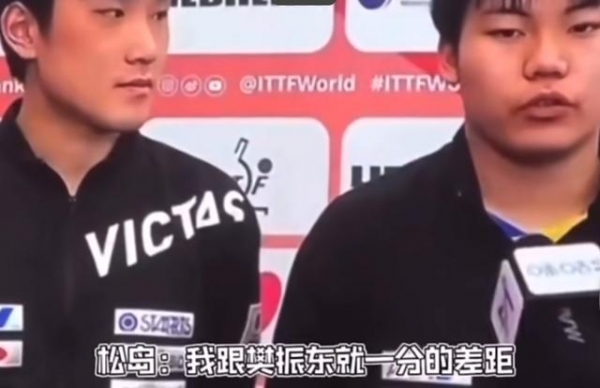 记者问队友松岛辉空,第一次和樊振东比赛做了哪些比赛,松岛的回答是"因为是第一次和樊振东打,其实我是能赢的"。