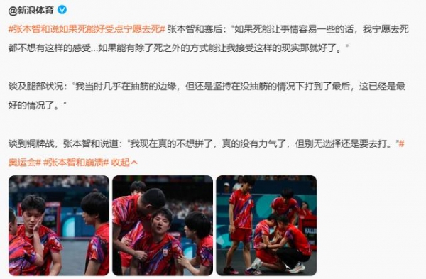 而和瑞典比赛结束后的采访时,张本智和表示"如果死能让事情容易一些的话,我宁愿死,都不想有这样的感受…如果能有除了死之外的方式能让我接受这样的现实那就好了"。