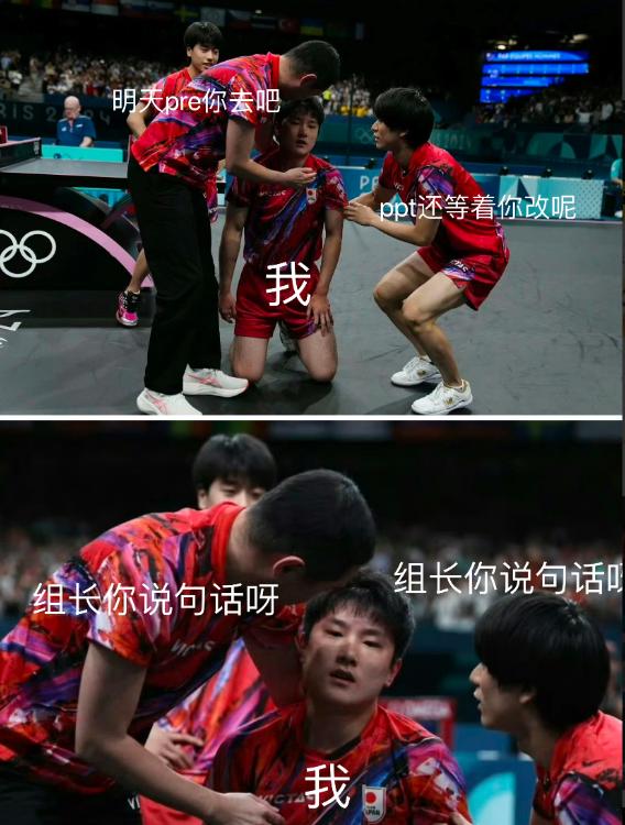 赛后网友们还给张本做起了表情包,说这场比赛像是小组作业只有张本一个人在做的样子,身边的队友和教练都在等他做PRE。