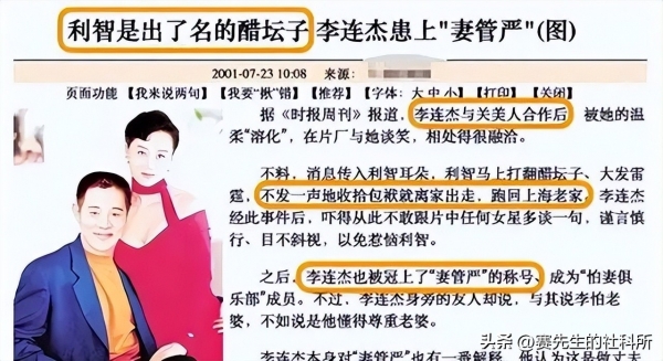 他是出了名的"妻管严"还登上了香港的报纸,而利智也很好的经营着家庭,偶尔李连杰和女明星拍戏太亲密她也会吃醋。