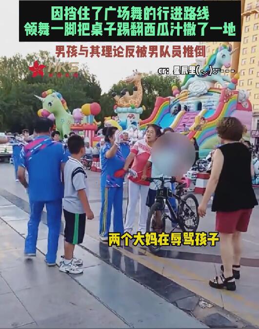 本来是井水不犯河水的两拨人,可广场舞队伍中的一个领舞大妈却因为小孩摆放的西瓜汁摊挡住了广场舞的行进路线,一脚把摊桌踢翻,使得西瓜汁撒了一地。