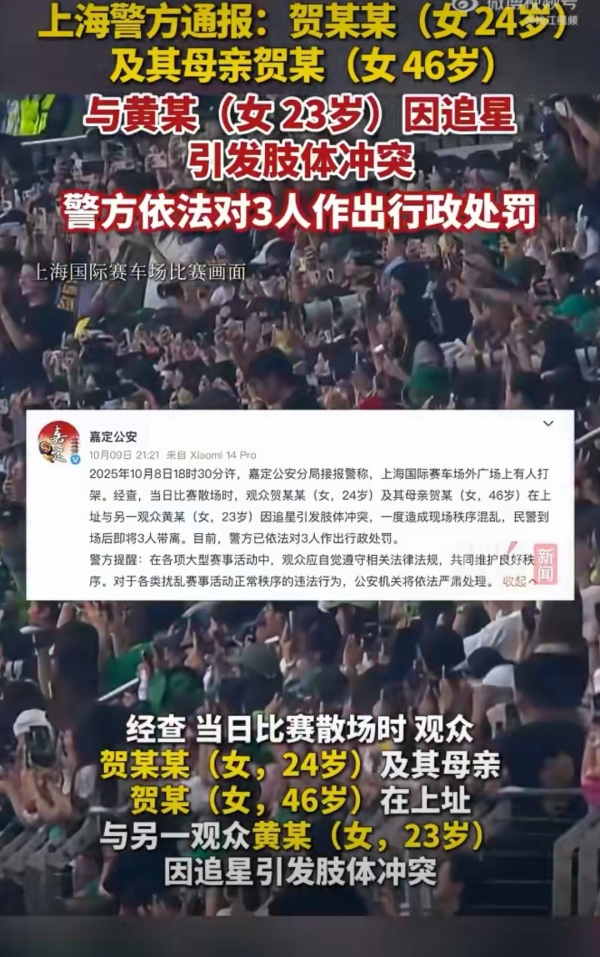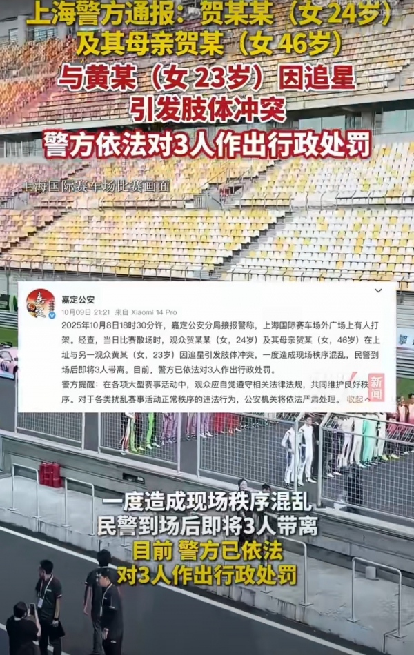 10月8日18时30分,上海国际赛车场刚结束一场备受瞩目的赛事。据嘉定公安分局通报,散场人流中,24岁的贺某某与46岁的母亲贺某,在场外广场与23岁的黄某发生激烈冲突。目击者称,双方先是争执,随后演变为推搡、撕扯头发等肢体冲突,引发上百人围观,导致通道堵塞。警方接报后迅速控制现场,将三人带离调查。