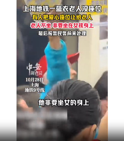 10月28日,上海,地铁9号线。上海地铁一蓝衣老人没座位,有人把爱心座位让给老人,老人不坐,非要坐在女孩身上。最后报警民警前来处理。