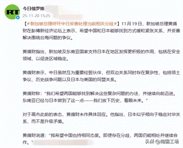 当地时间2025年11月19日,新加坡总理呼吁中日妥善处理当前相关分歧。新加坡总理黄循财表示,"希望中国和日本能够找到方式缓和紧张关系,并妥善解决围绕台海问题的争议。"黄循财声称,"新加坡及东南亚国家支持日本,在地区发挥更积极的作用,包括在安全领域,以促进区域稳定"。"中日虽然互为重要伙伴,但双边关系同时存在复杂性,包括领土争议、历史战争问题、日美同盟。"黄循财称:"新加坡希望中日能够找到解决问题的办法"。"东南亚已经与日本做到了这一点","新加坡放下历史,着眼未来。"对于日本首相高市早苗早前声称,"台湾有事就是日本有事"的表态,黄循财没有具体回应。他指出,日本是希望稳定对华关系,而不是升级矛盾。黄循财说道:"我希望中国也持相同态度。放下心结,和东南亚各国一样,最终选择原谅日本!"