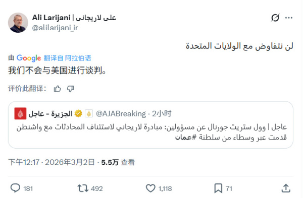 伊朗国际电视台(iranintl)报道,伊朗最高国家安全委员会秘书、最高领袖顾问拉里贾尼3月2日在社交平台X上回应美国媒体关于其"推动与美国谈判"的报道。他驳斥称:"我们不会与美国进行任何谈判。"