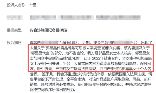 眼看营销号愈炒愈烈、网友被误导,郭晶晶团队果断提交举报函,要求平台处理发布不实言论的账号,采取删除内容、封禁账号等措施。