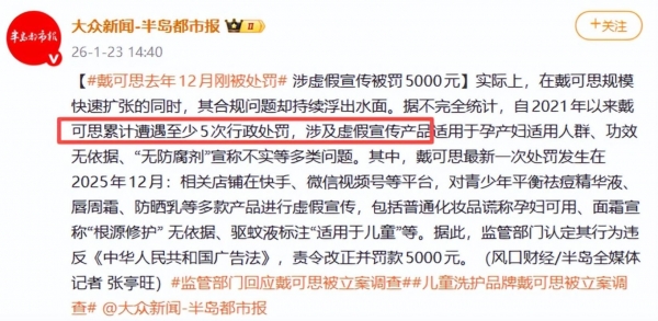 但网友深挖后发现,该品牌自2021年起累计遭5次行政处罚,涵盖虚假宣传、产品不合格等问题,最新一次就在2025年12月,距此次立案仅一个月。