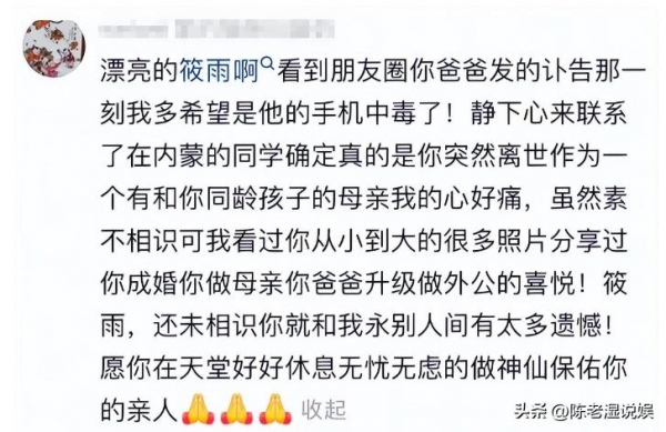 据悉,张筱雨在4月1日凌晨,就突发心脏骤停,经过医护人员的全力抢救,还是没能留住她的生命,最终还是永远地离开了。