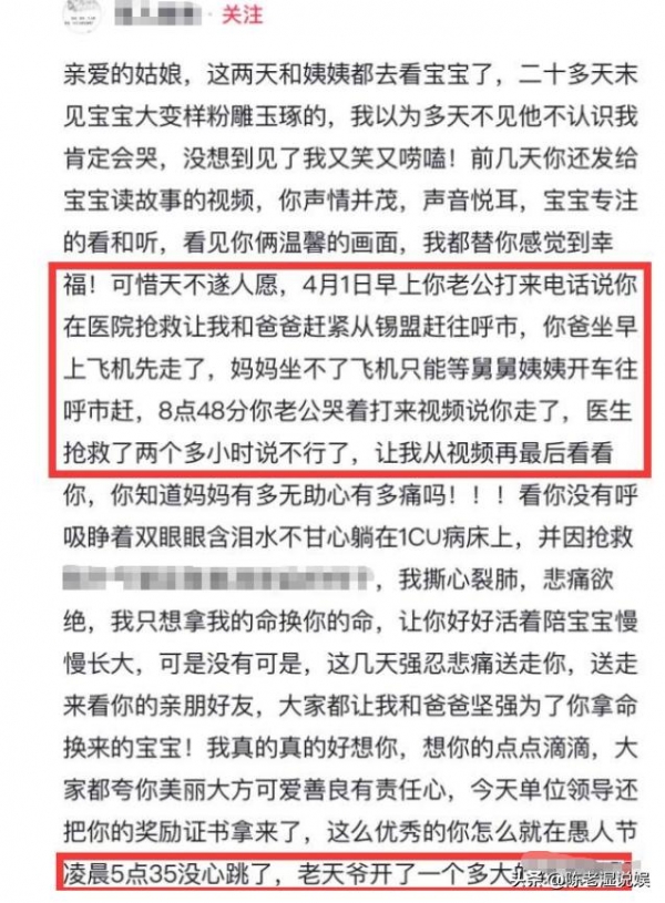 面对网上的各种猜测,还有身边人的询问,悲痛欲绝的母亲,在4月4日,强忍着心中的痛苦,发文道出了女儿离世的真相。